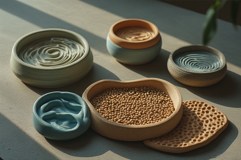 Slow Feeder Bowls: Available in spirals, puzzles, flower shapes, and maze-like patterns. Materials include BPA-free plastic, stainless steel, and ceramic.